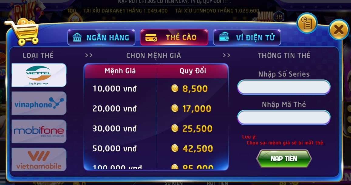 Nạp tiền bằng thẻ cào tại Rikvip